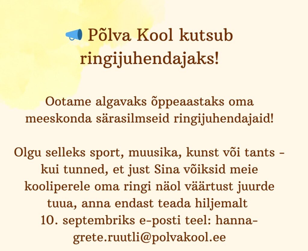 Põlva Kooli kõikide õppekohtade huviringidesse registreerimine toimub ajavahemikul 11.09 kell 7.00 – 18.09 kell 23.59. Huviringid alustavad tööd alates 1.